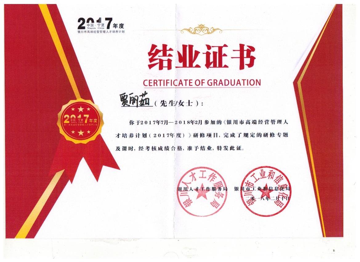 賈麗茹銀川市高端經(jīng)營管理人才培養(yǎng)計劃(2017年度)結業(yè)