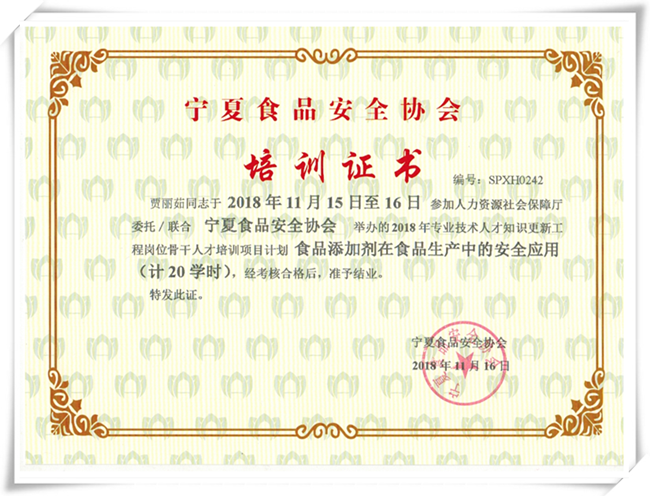 寧夏食品安全協(xié)會培訓結業(yè)證書