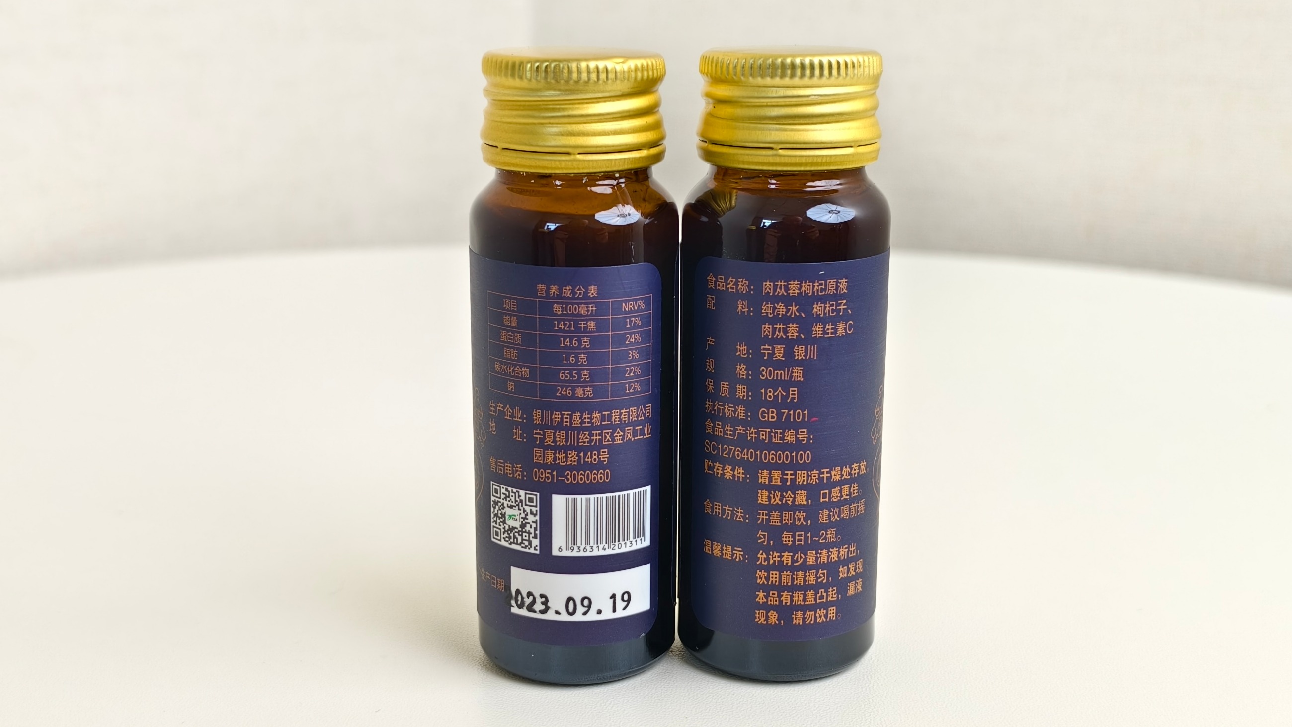 【配料】純凈水、枸杞子、肉蓯蓉(帶鱗葉的肉質莖)