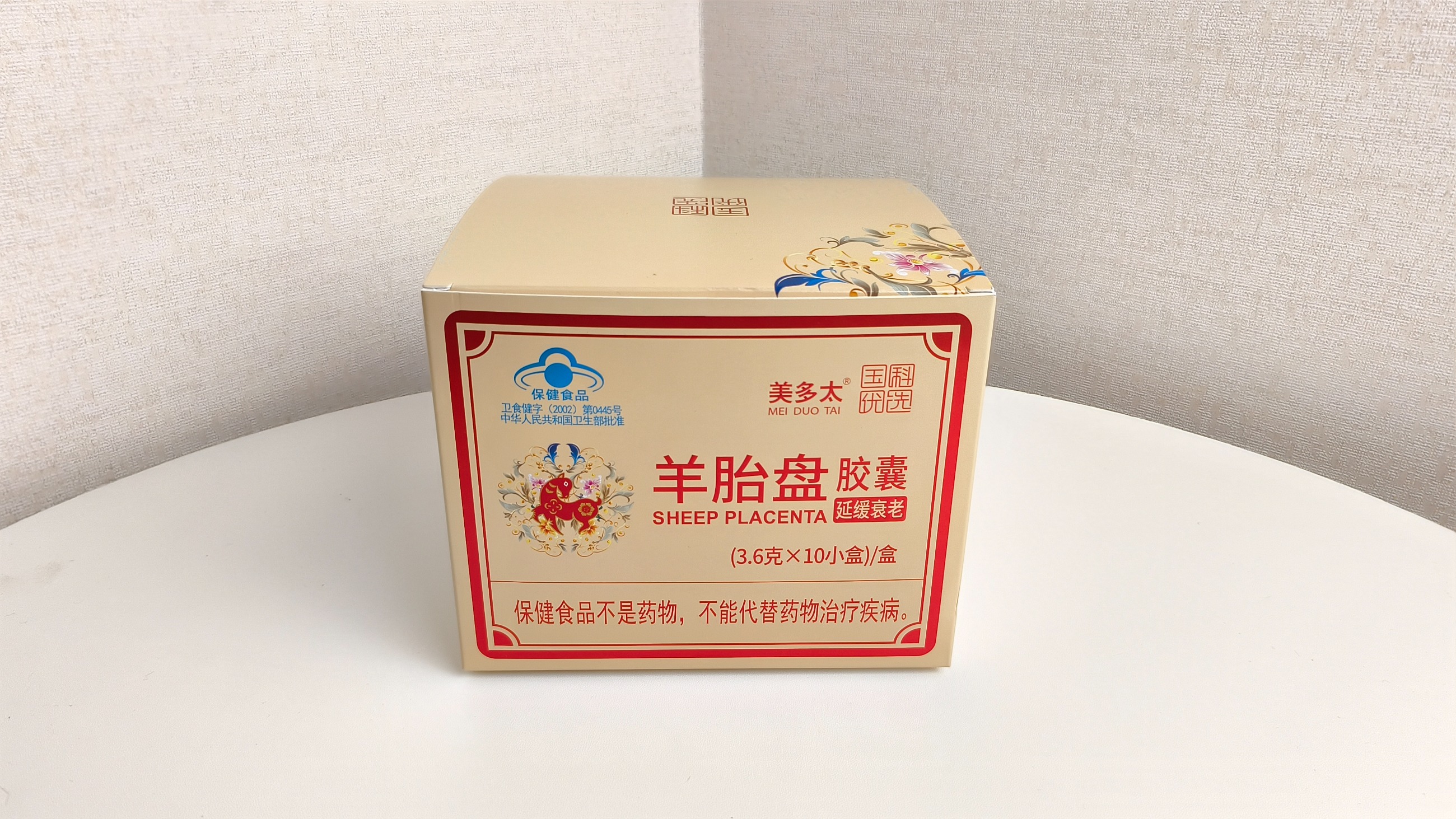 本品是以羊胎盤、淫羊藿、菊花、紅花為主要原料制成的保健食品,經功能試驗證明,具有延緩衰老的保健功能【主要原料】羊胎盤、淫羊藿、菊花、紅花、淀粉【保健功能】本品經動物實驗評價,具有延緩衰老的保健功能【適宜人群】中老年【不適宜人群】異體蛋白過敏者、少年兒童、孕產婦及月經過多者【食用方法及食量】早晚各1次,每次2粒;空腹,溫開水吞食【保質期】24個月【規格】300mg/種【貯藏方法】置陰涼干燥處【執行標準】JQ/ZRSW 0001S【批準文號】衛食健字 (2002)第0445號